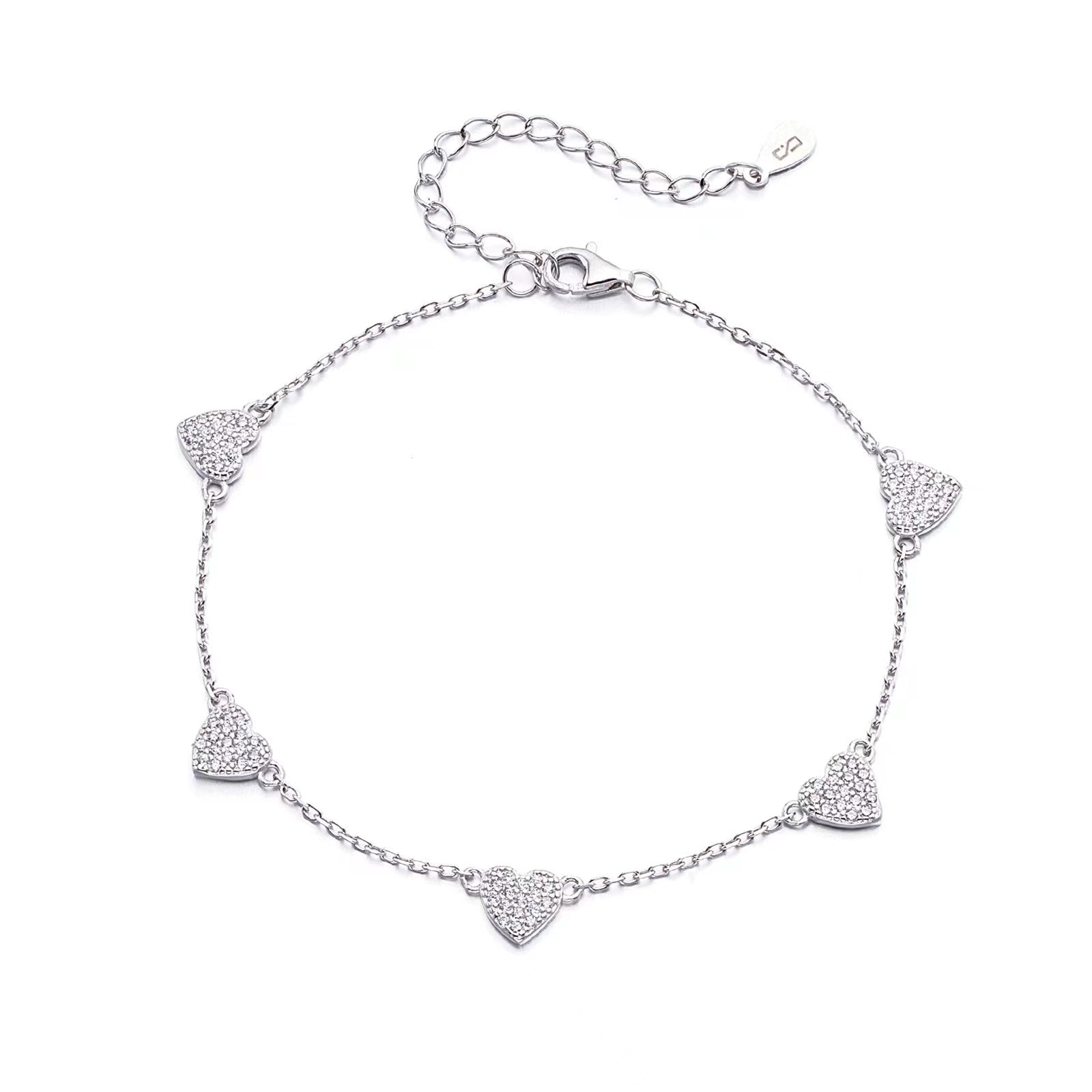 צמיד לרגל בעיצוב לבבות, עשוי כסף אמיתי 925 ומשובץ אבני זרקון נוצצות. חמשת התליונים בצורת לב יוצרים מראה אלגנטי, רומנטי ומלא ברק – תוספת מושלמת לכל הופעה, מהיומיומית ועד לאירוע חגיגי.אורך הצמיד: 19+5 ס״מ.