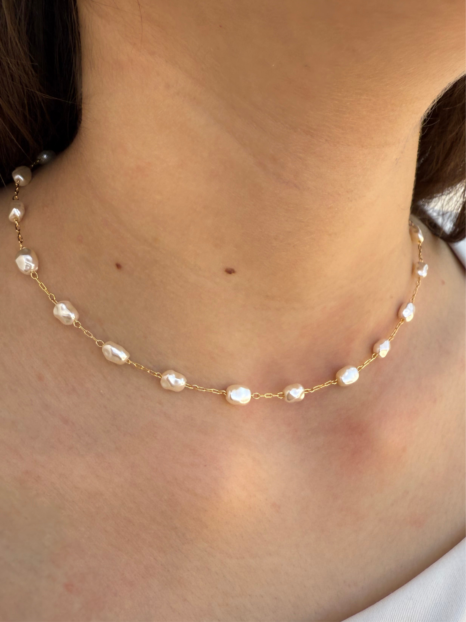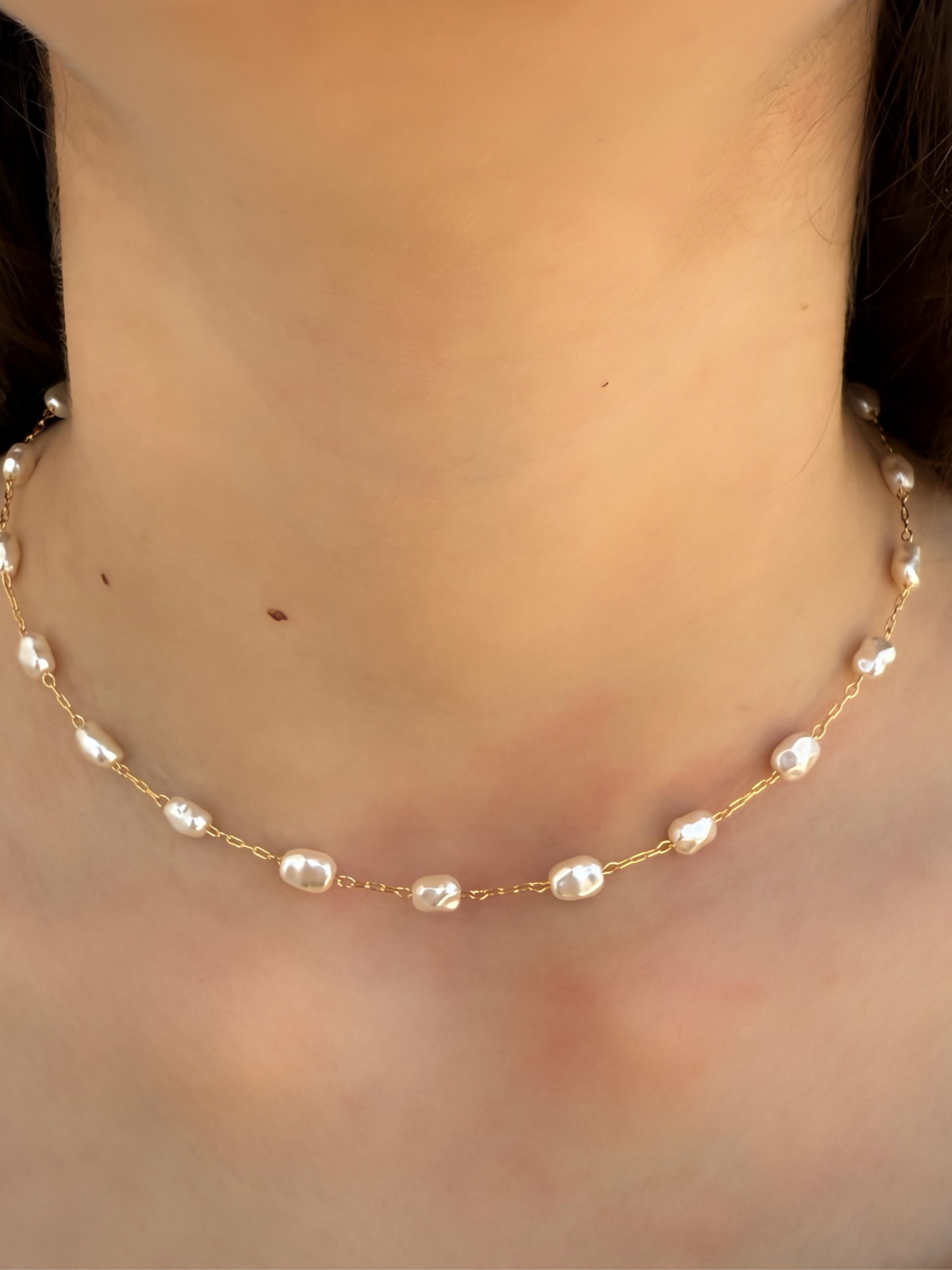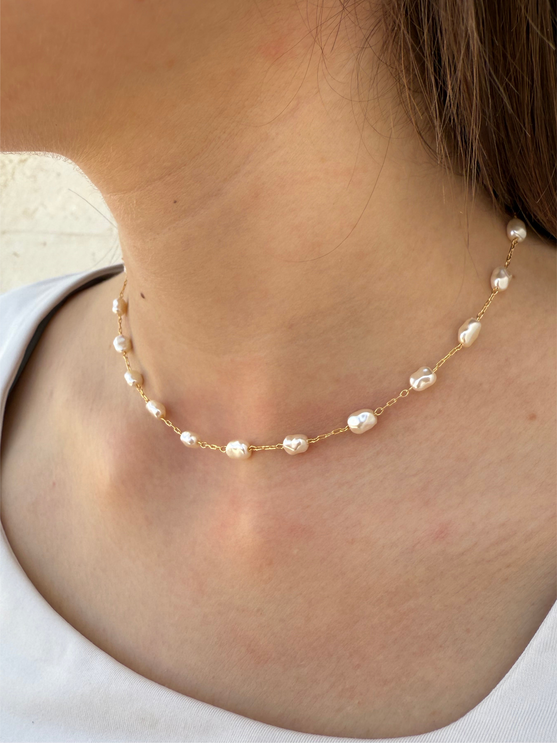 שרשרת מזהב 18 קראט, תוצרת ברזיל, עם שרשרת עדינה המעוטרת בפנינים לאורך כל האורך