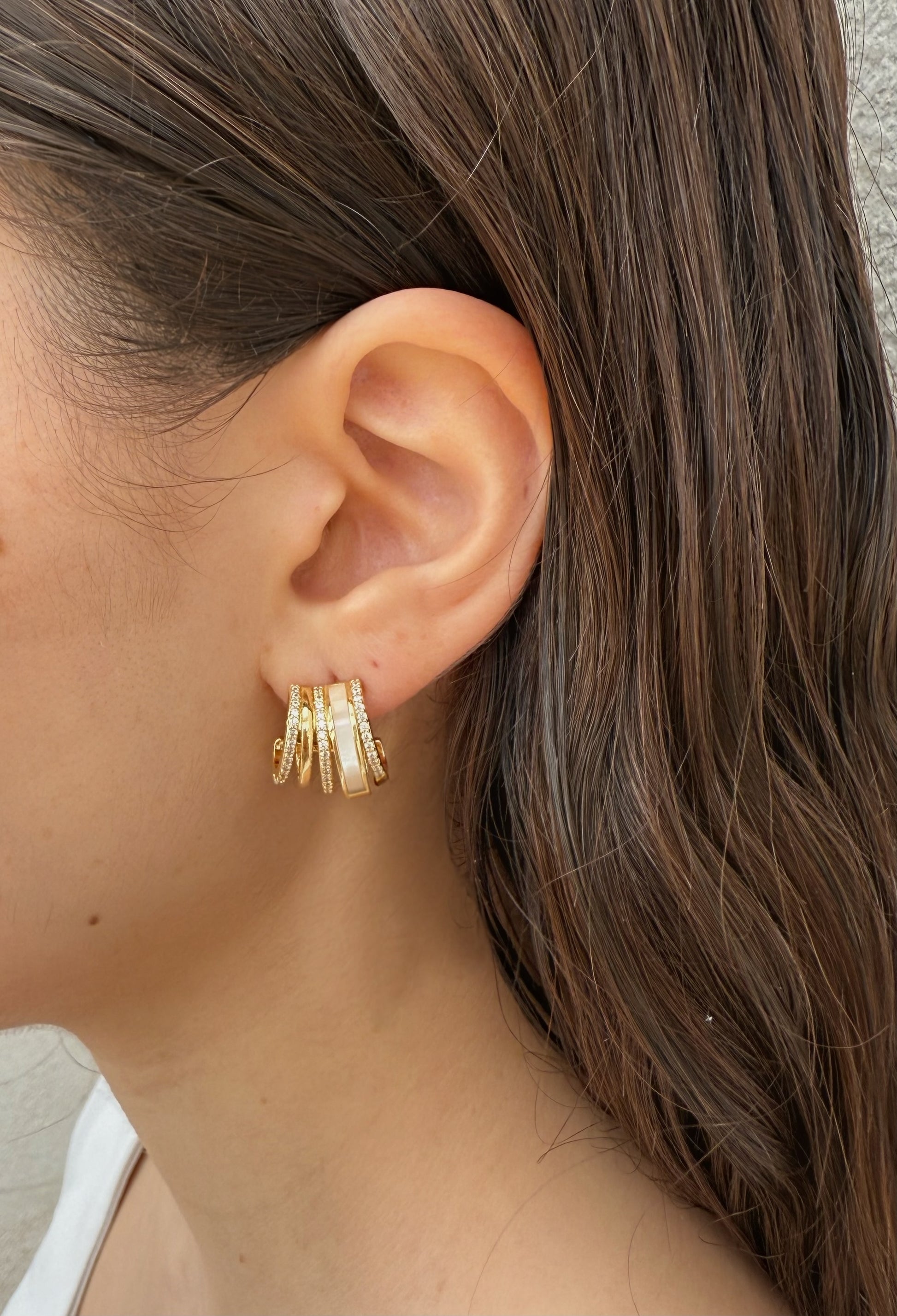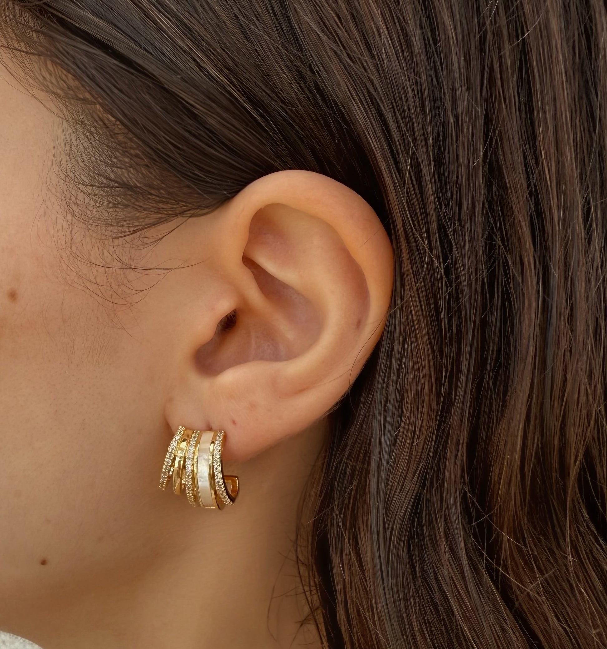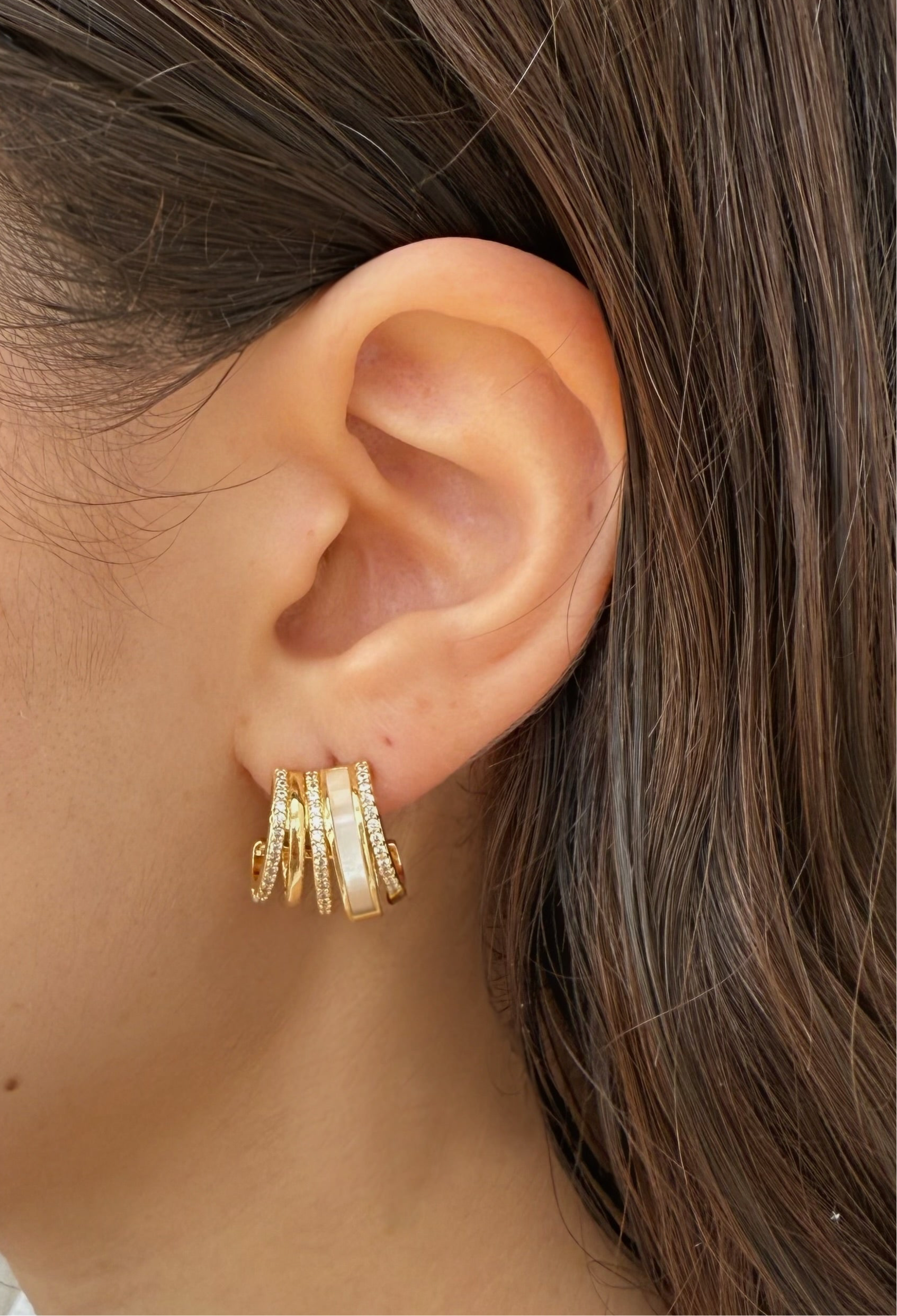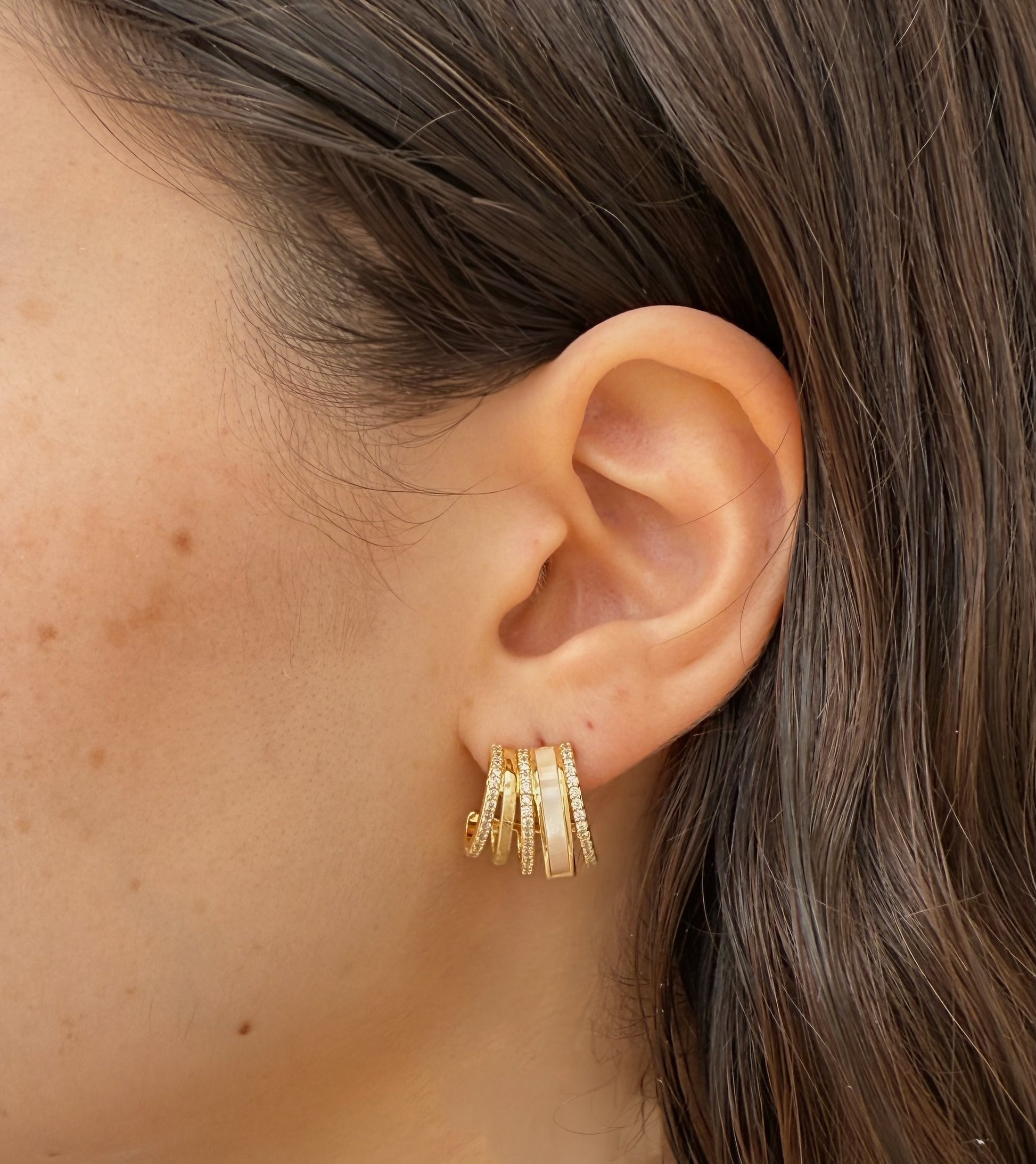 מקולקציית ברזיל שלנו, בציפוי זהב 18 קראט. בעיצוב של שכבות חישוקים עדינים, עם פרטי אם הפנינה ואבנים משובצות זרקונים