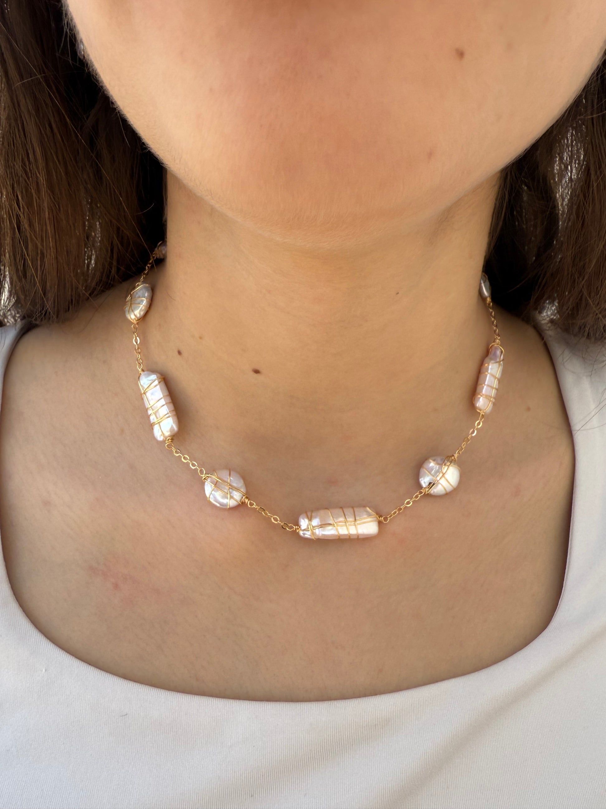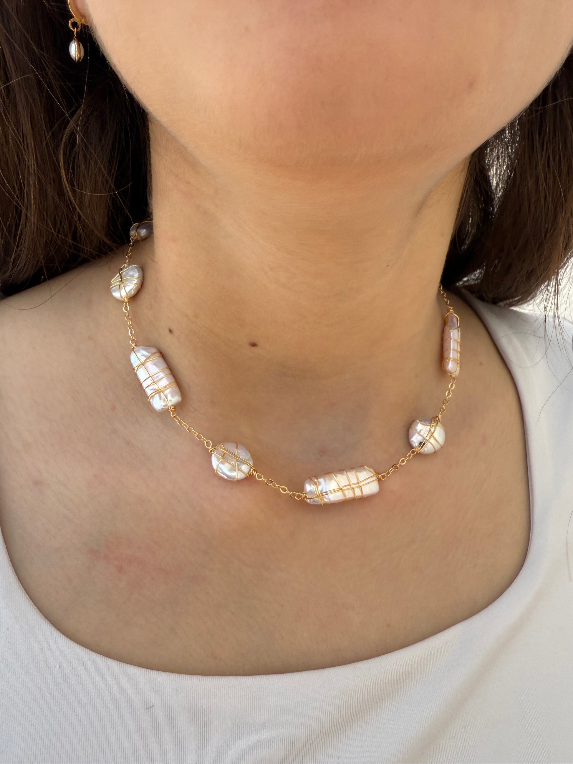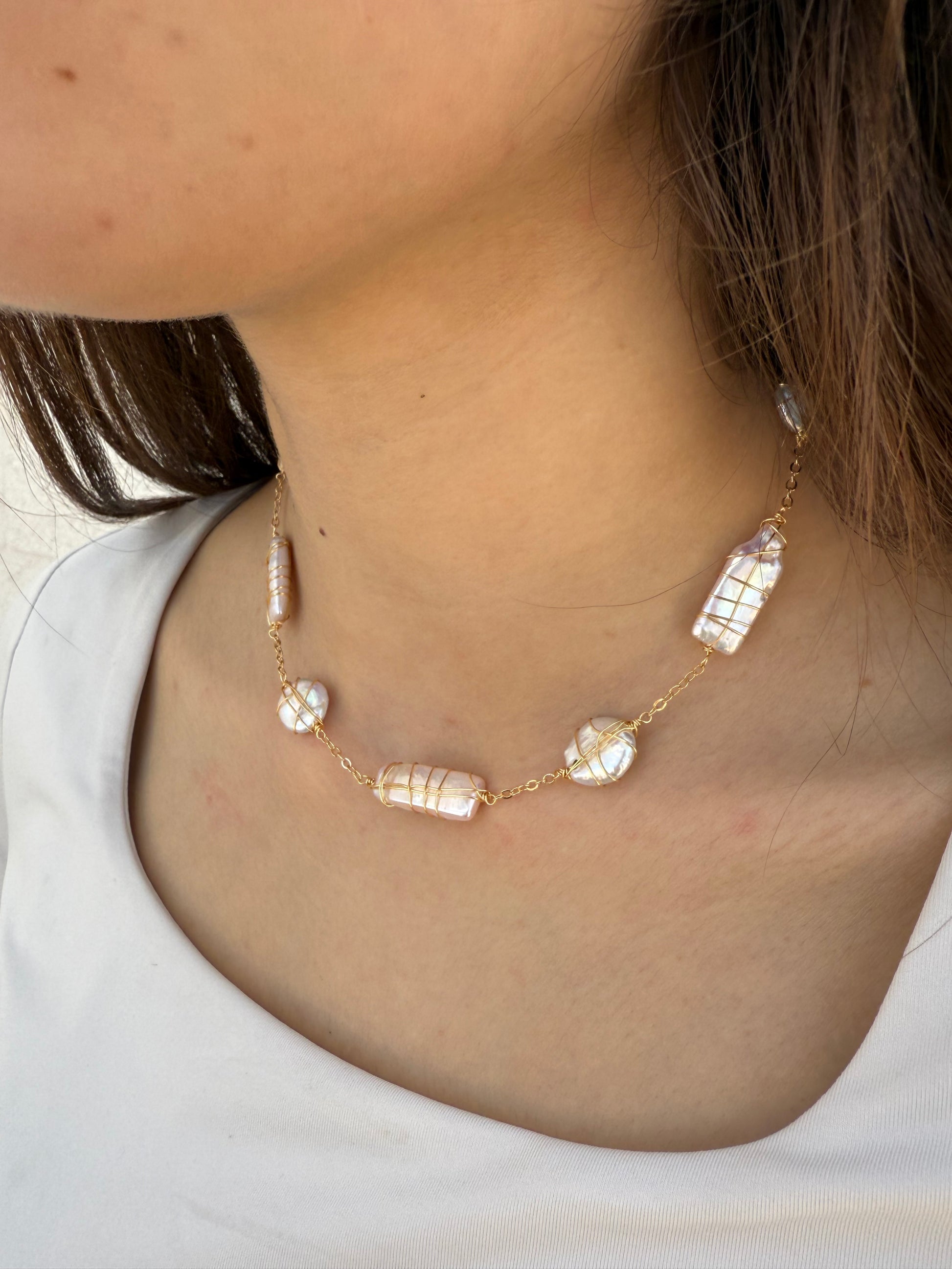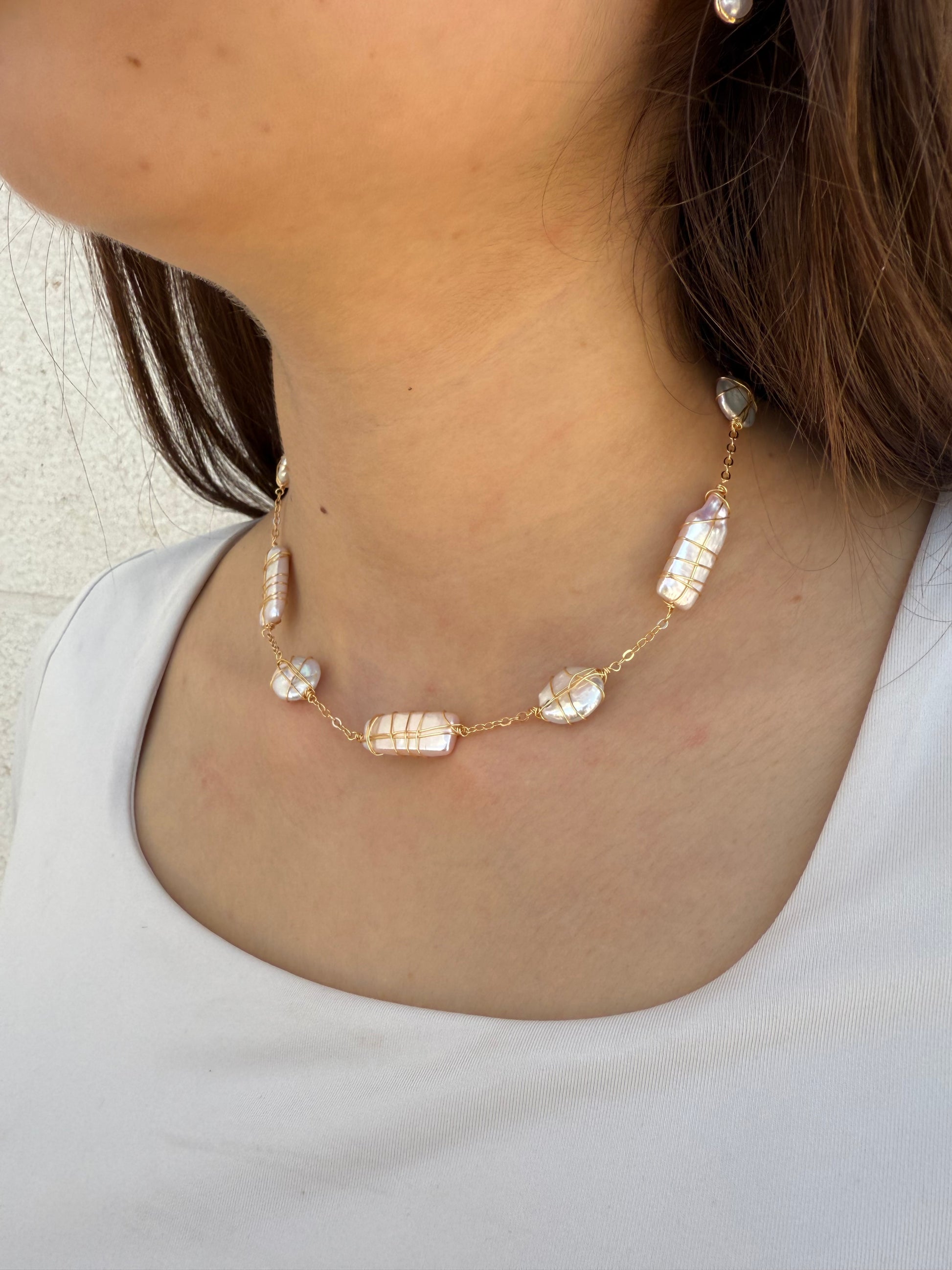 שרשרת מזהב 18 קראט עם פנינים טבעיות עטופות בחוטים מוזהבים. תוצרת ברזיל