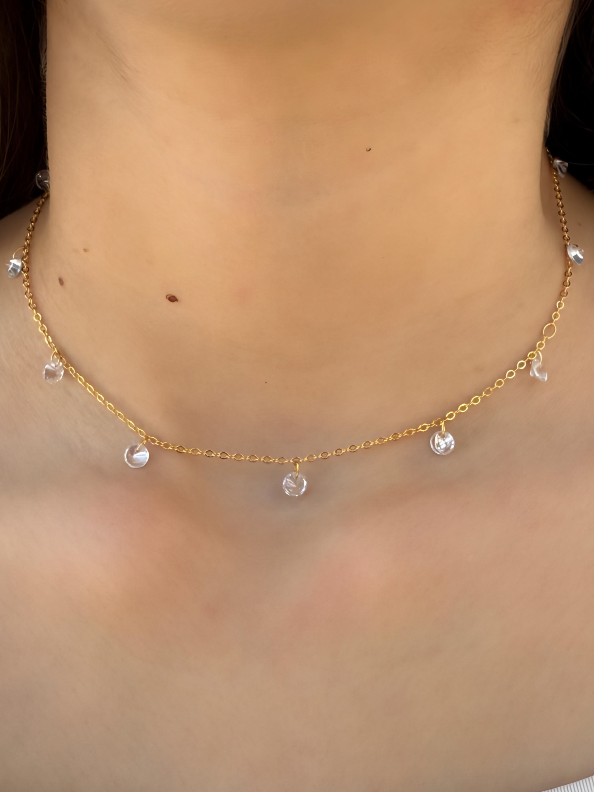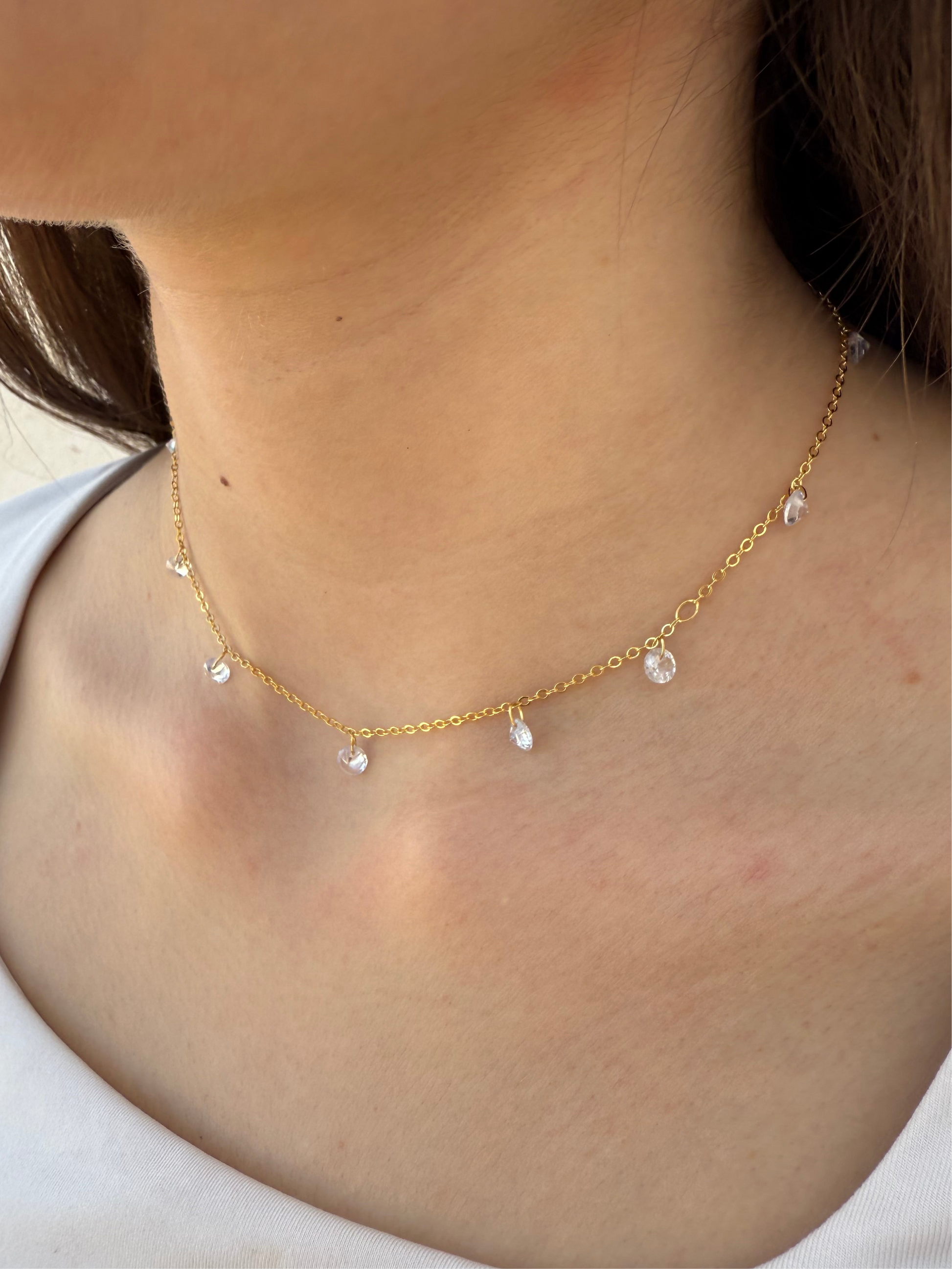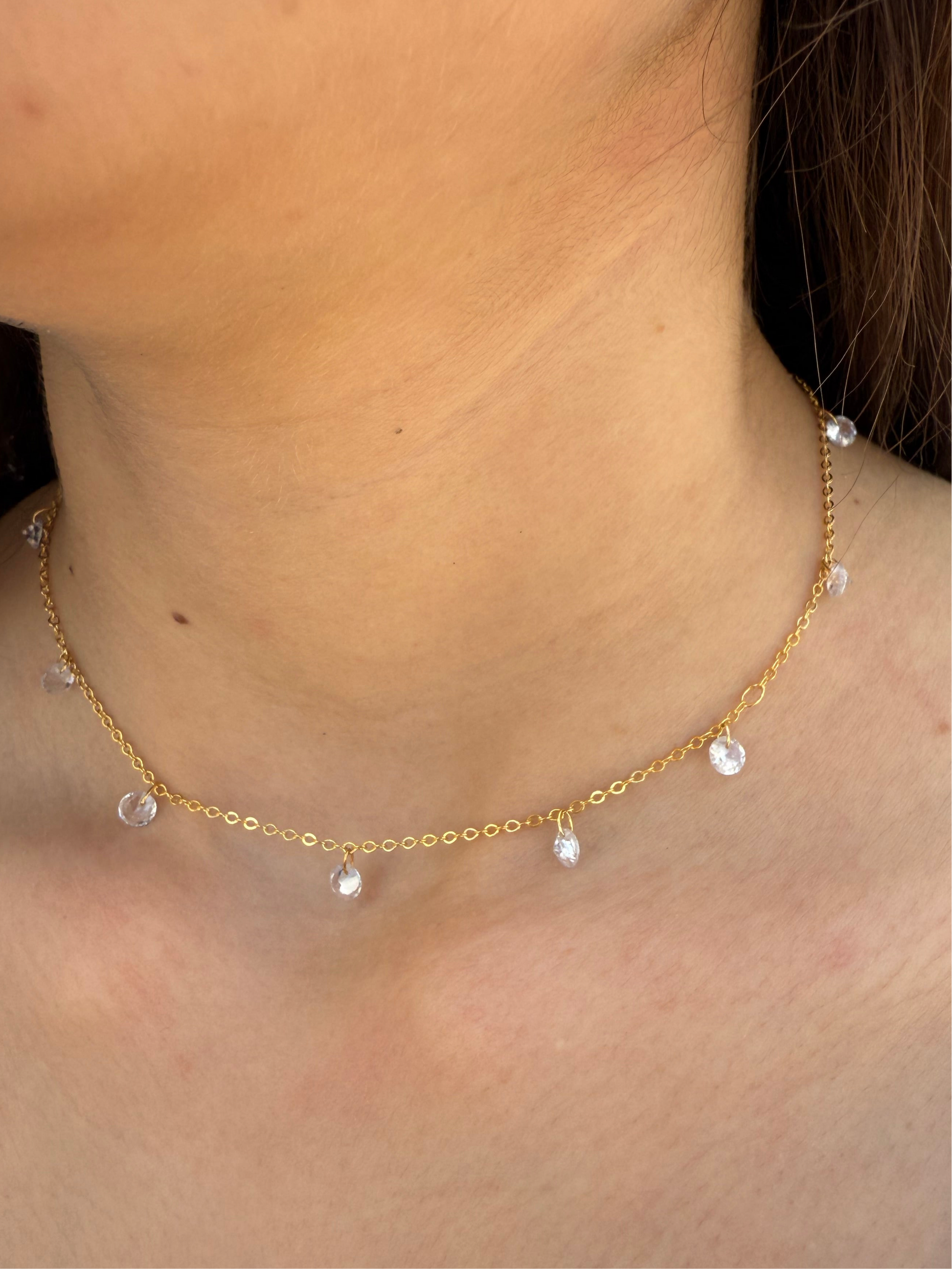 שרשרת מזהב 18 קראט, תוצרת ברזיל, עם שרשרת מקושטת באבני זירקון קטנות התלויות עליה.