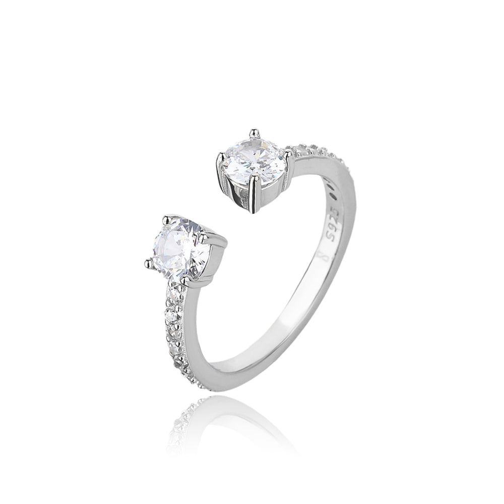 טבעת פתוחה עשויה כסף אמיתי 925, עם שני זירקונים מרכזיים עגולים בקצותיה ושיבוץ עדין של אבני זירקון לאורך החישוק. עיצוב אלגנטי ומודרני שמוסיף ייחודיות וברק נשי לכל הופעה – מושלם לענידה יומיומית וגם לאירועים חגיגיים.
